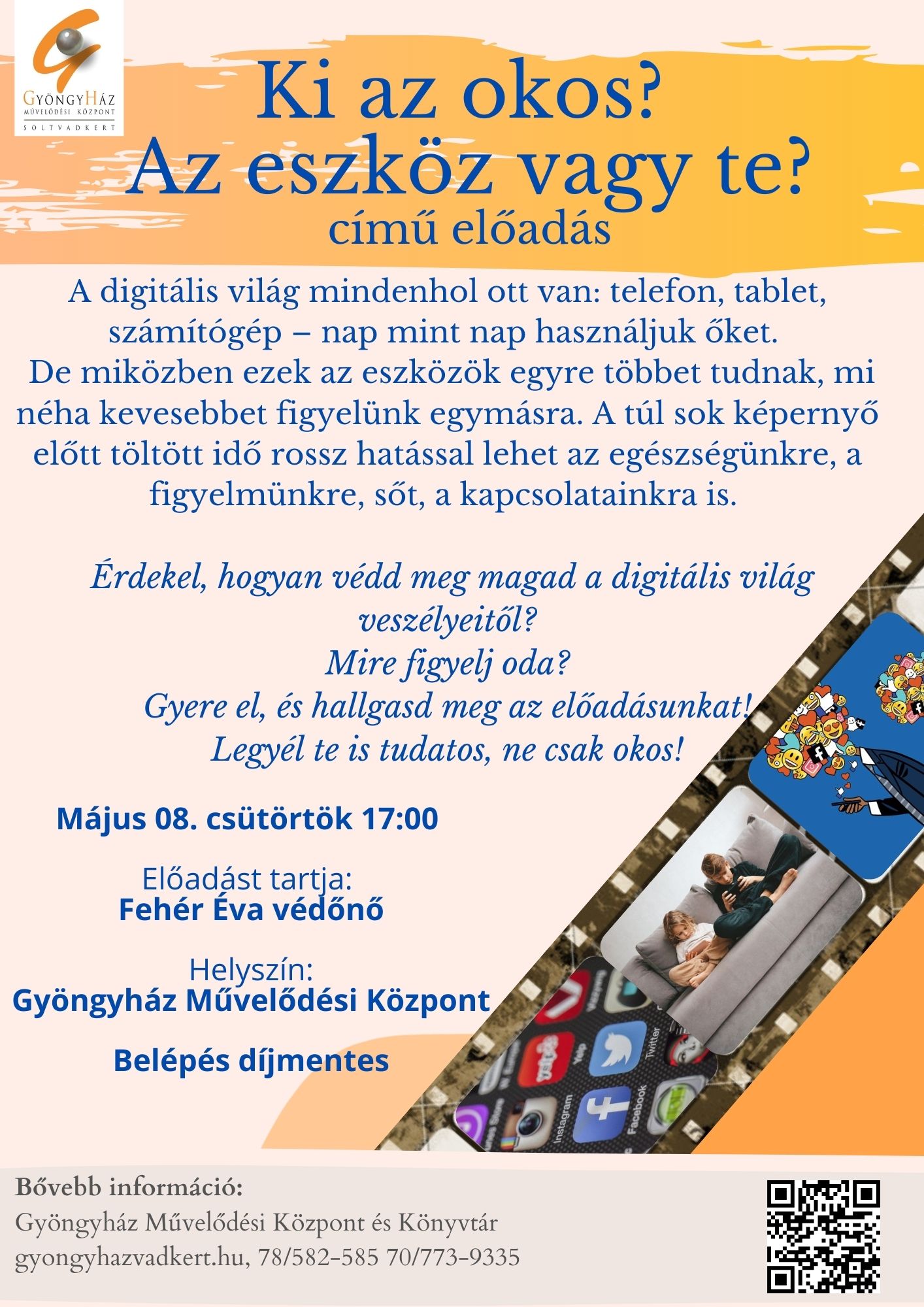 OKOS ESZKÖZÖK ÉS A MÉDIA VESZÉLYEI címmel előadás tekinthető meg a Gyöngyház Művelődési Központban Fehér Éva védőnő előadásában.