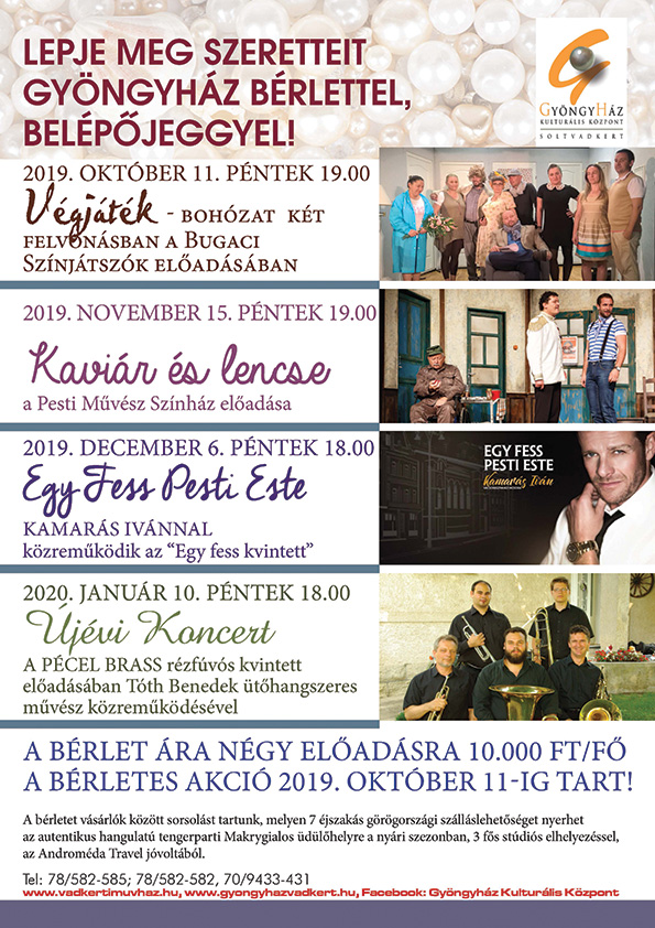 A naptár célja, hogy az érdeklődő hónapról hónapra, pontosan követhesse a megrendezésre kerülő városi és a Gyöngyház rendezvényeket. A városi rendezvényeket csupa nyomtatott nagybetűkkel, míg a Gyöngyház programjait ‘Gy‘ jelöléssel tüntetjük fel.