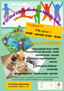 Szeretnél suli után egy helyet, ahol kikapcsolódhatsz, játszhatsz, beszélgethetsz, és közben még fejlődhetsz is? Akkor a P’21 pont neked szól!