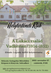 Helytörténeti Klub a Gyöngyházban 2025. november 27-én, csütörtökön 17 órától. Téma: A Lukács család Vadkerten (1804-1852)