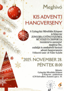 Kis Adventi Hangverseny 2025. november 28- án, pénteken 18:00 a Gyöngyház Művelődési Központ és Könyvtár színháztermében. Szeretettel várunk minden érdeklődőt!