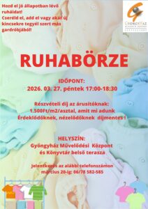 Ruhabörze május 23-án, pénteken 16 órától a Gyöngyház belső teraszán. Jelentkezés, asztalfoglalás a 06-78/582-585, ill. a 06-70/773-9335- ös telefonszámokon.