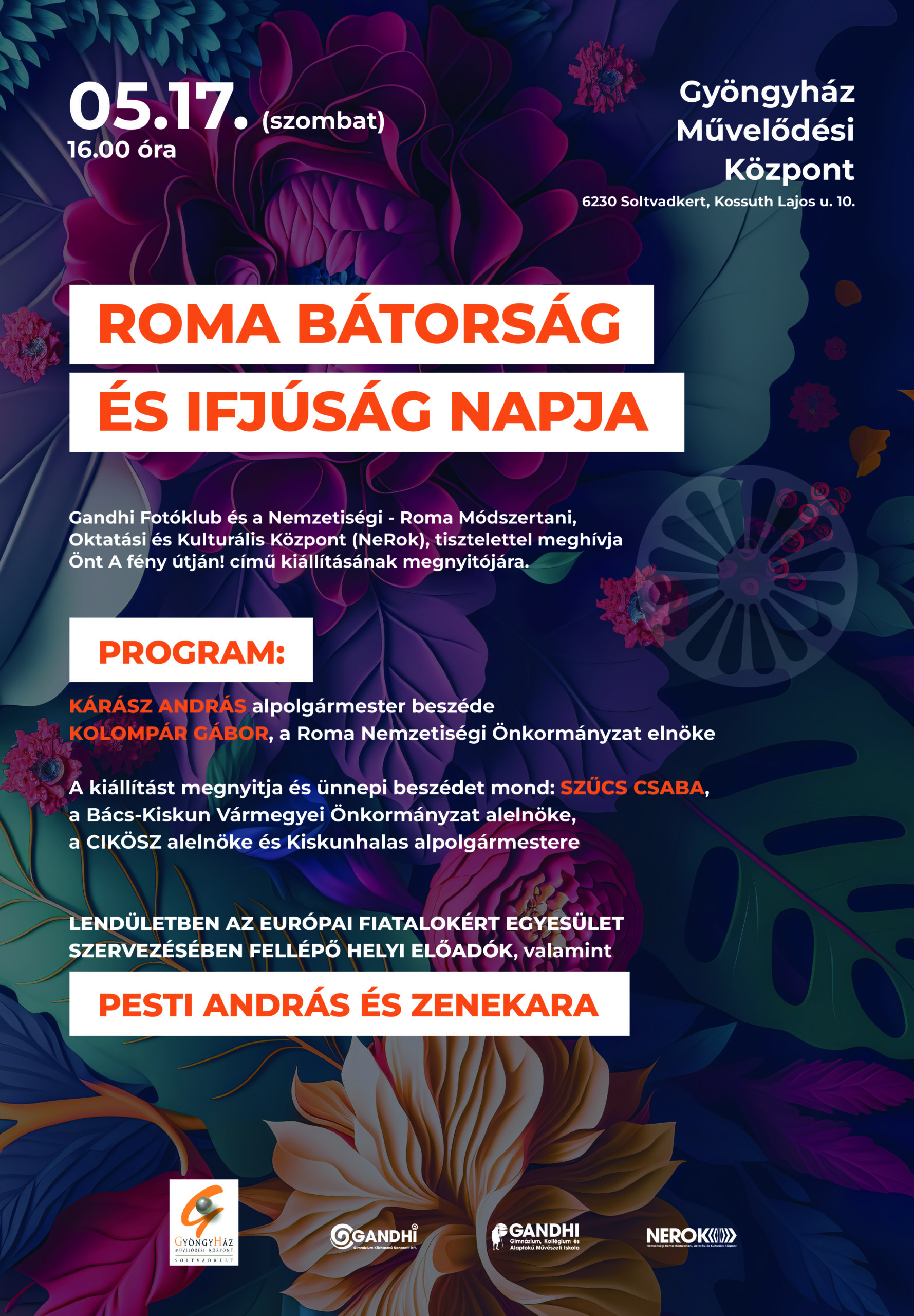 ROMA BÁTORSÁG ÉS IFJÚSÁG NAPJA alkalmából a Gandhi Fotóklub kiállításmegnyitója lesz ‘A fény útján’ címmel május 17-én, szombaton 16 órától a Gyöngyház Művelődési Központban.