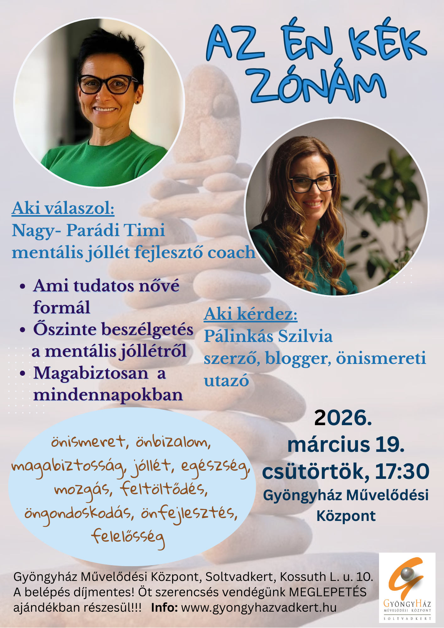 AZ ÉN KÉK ZÓNÁM- előadás az önbizalomról, önfejlesztésről március 19-én, csütörtökön 17:30- kor a Gyöngyházban. Előadó: Nagy- Parádi Timi, Moderátor: Pálinkás Szilvia. Az előadás díjmentes!