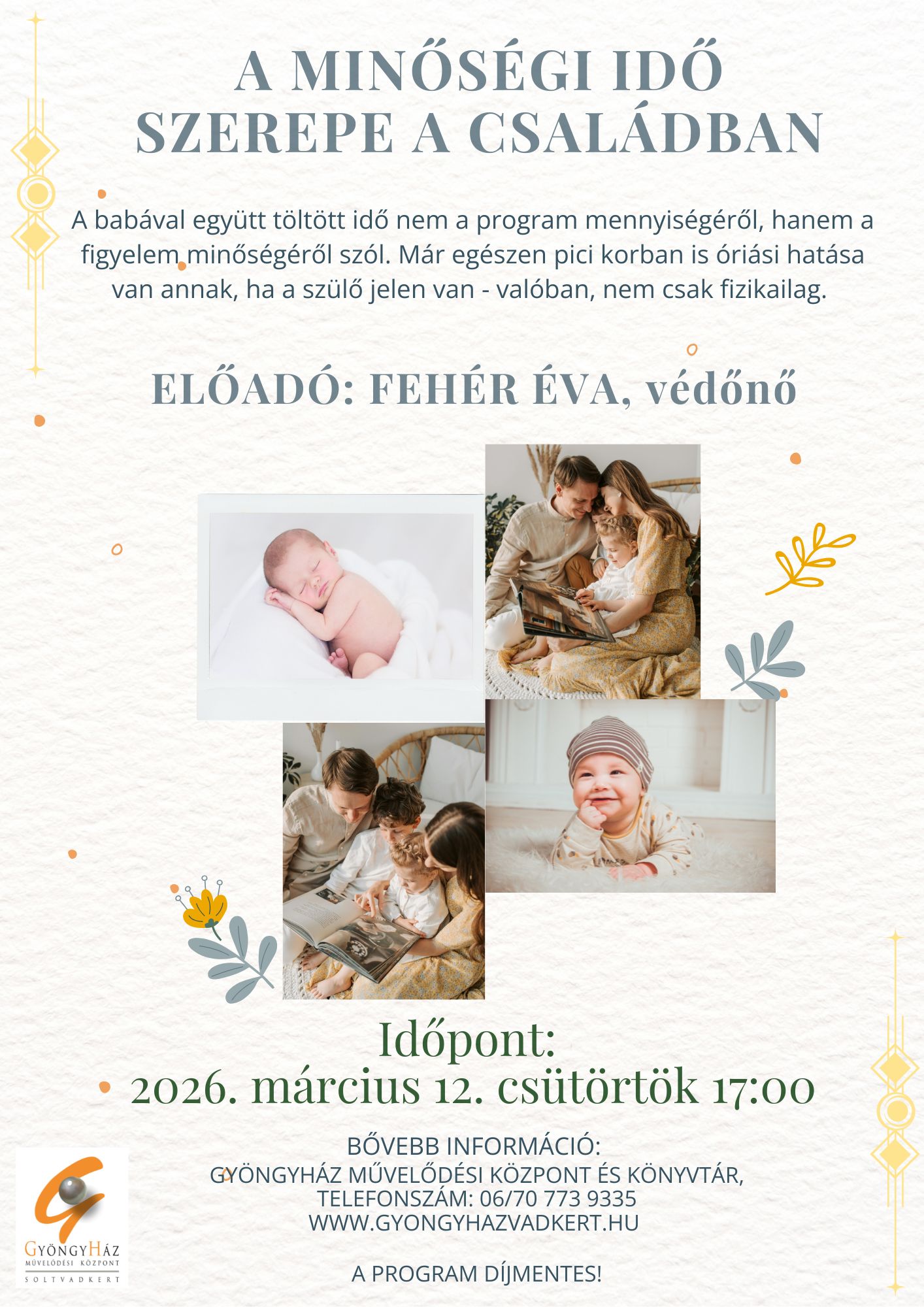 Fehér Éva védőnő előadása a minőségi idő szerepéről a családok életében 2026. március 12- én, csütörtökön 17 órakor a Gyöngyházban!
