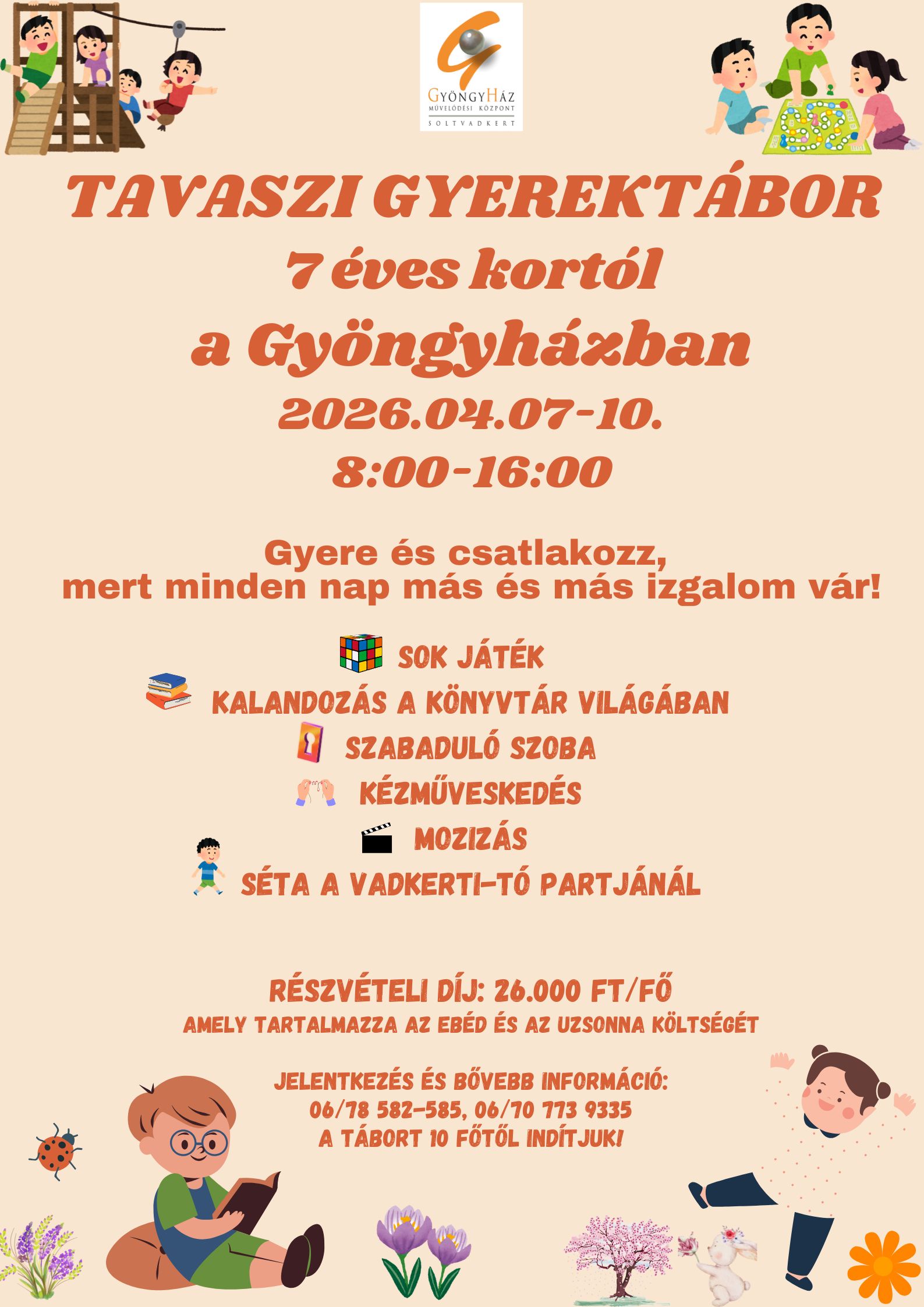 Tavaszi Gyerektábor a Gyöngyház szervezésében! Érdeklődni a Gyöngyházban személyesen, vagy a 06-78/582-585- ös telefonszámon…