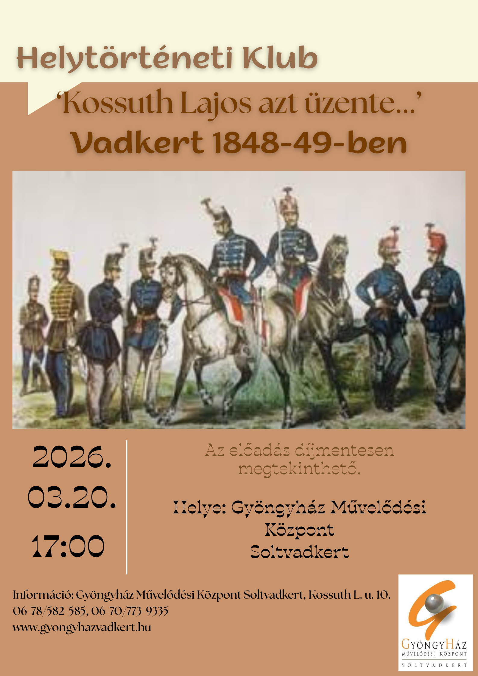 Helytörténeti Klub Légrády Andorral március 20- án, pénteken 17 órakor a Gyöngyház Művelődési Központban. Téma: Vadkert 1848-49- ben. A részvétel díjmentes!